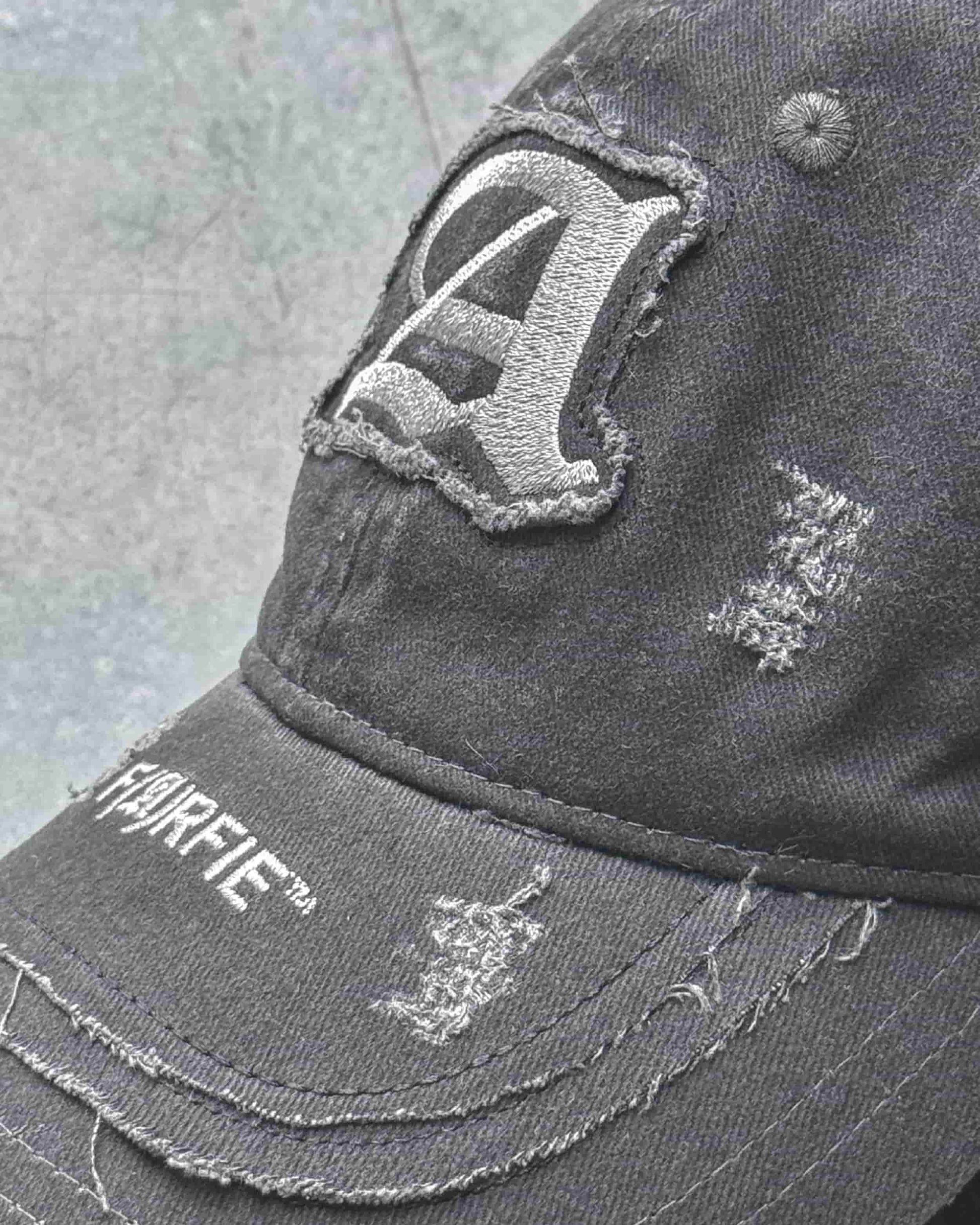 Кепка з сірого зістареного деніму з потертостями та рваними елементами.